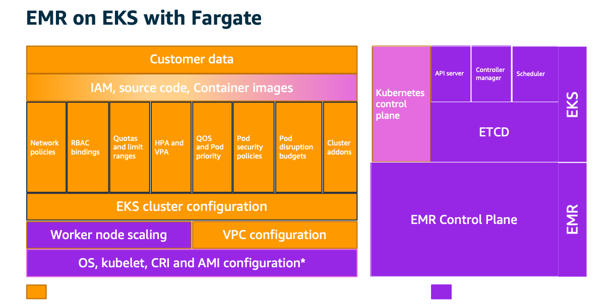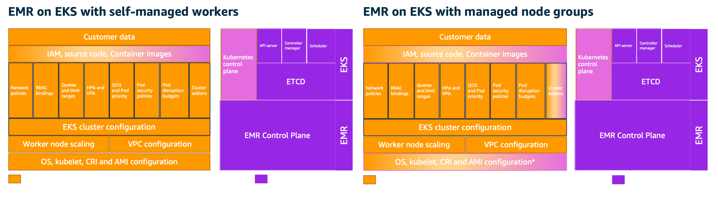 AWS assumes different levels of responsibility depending on the features being consumed by EMR on EKS customers. At this time of writing, the features from EKS are managed node groups, self-managed workers, and Fargate. We won’t go in-depth on these architectures as they are detailed in EKS best practices guide (https://aws.github.io/aws-eks-best-practices/security/docs/). Below diagrams depict how this responsibility changes between customer and AWS based on consumed features.