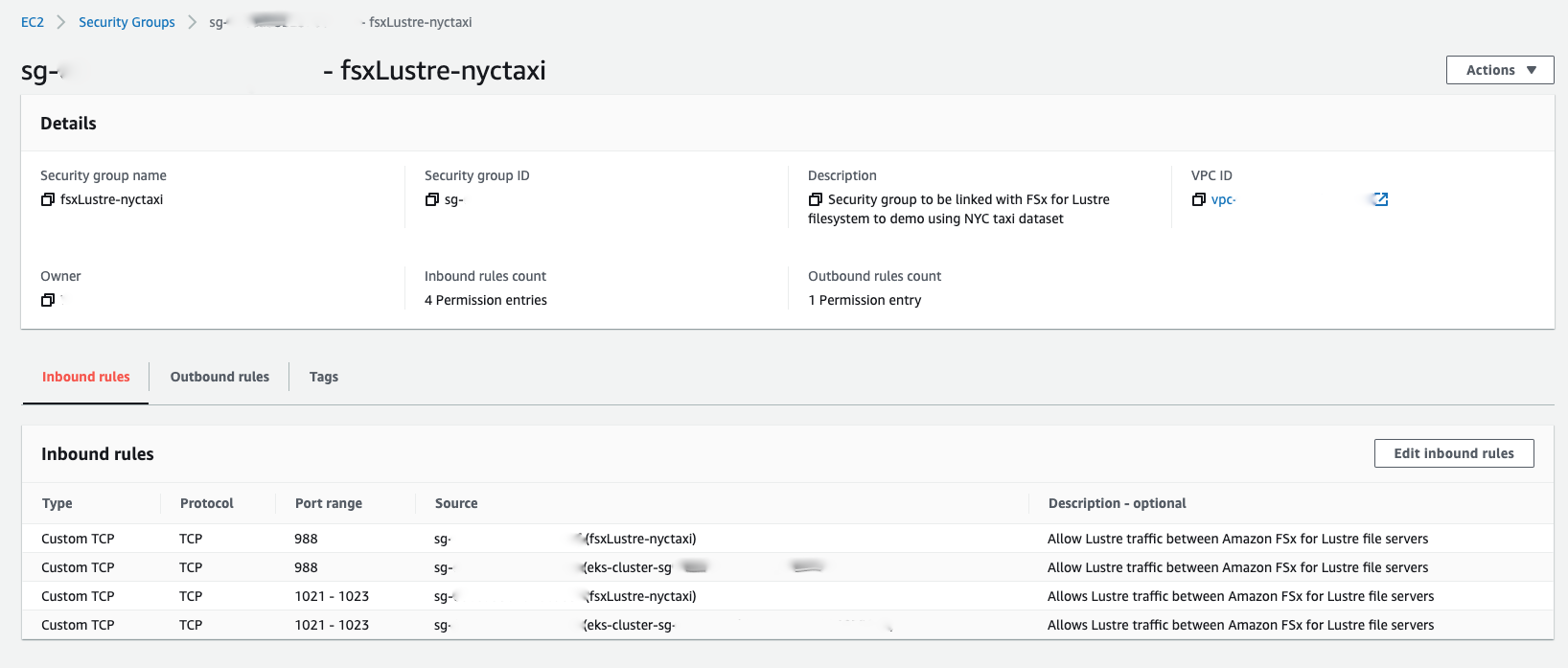 Create a Security Group to attach to FSx for Lustre file system as below